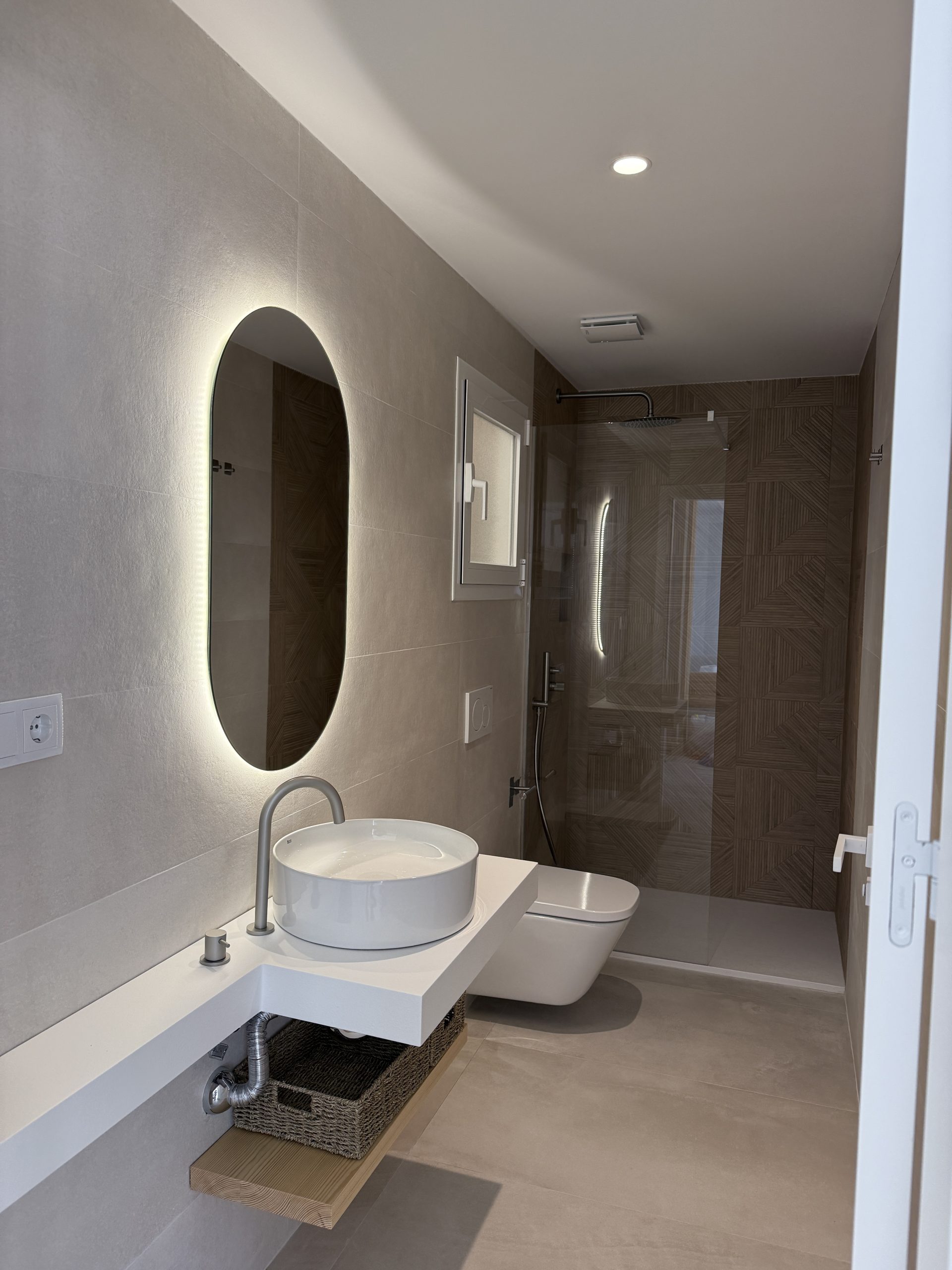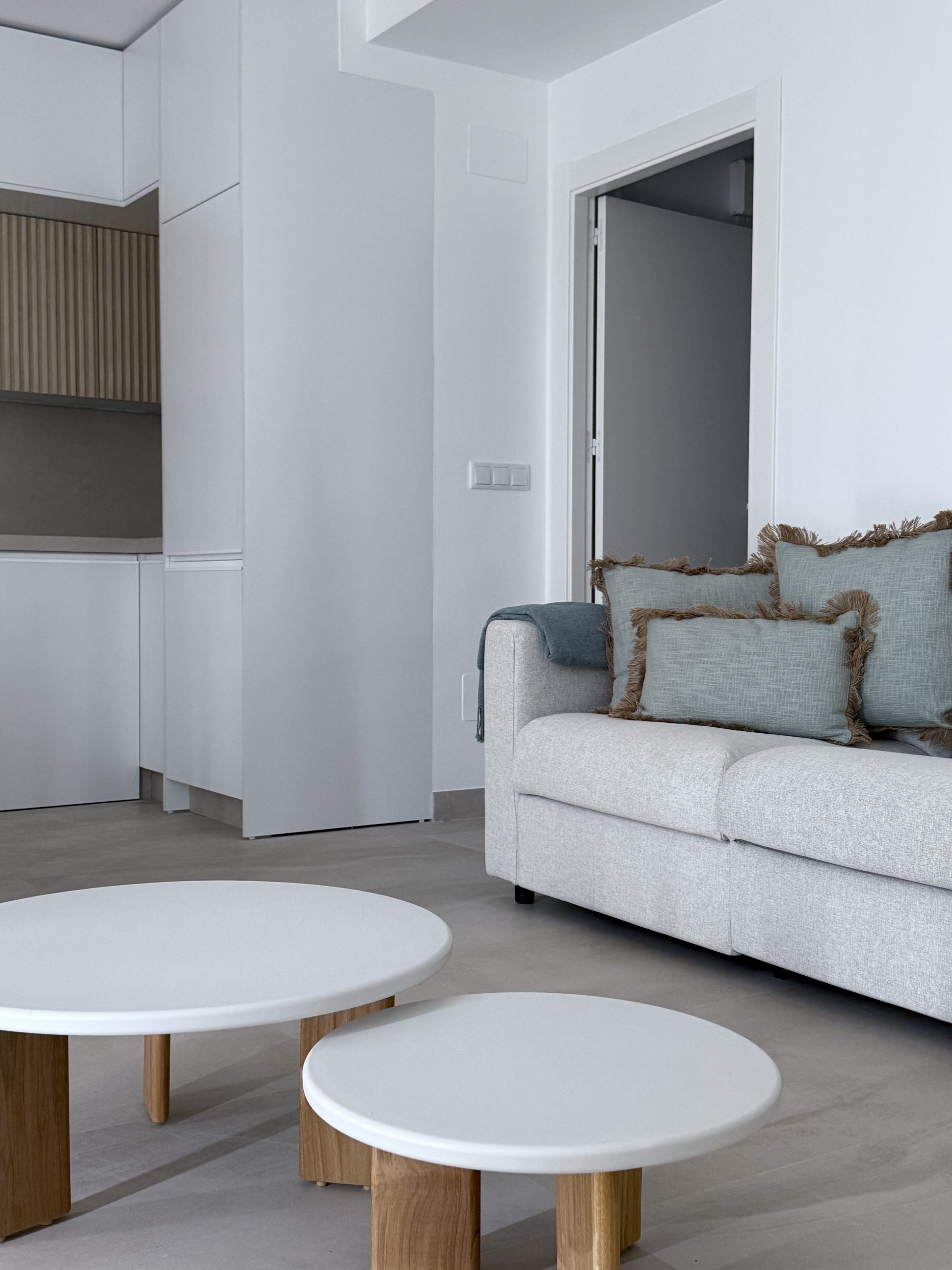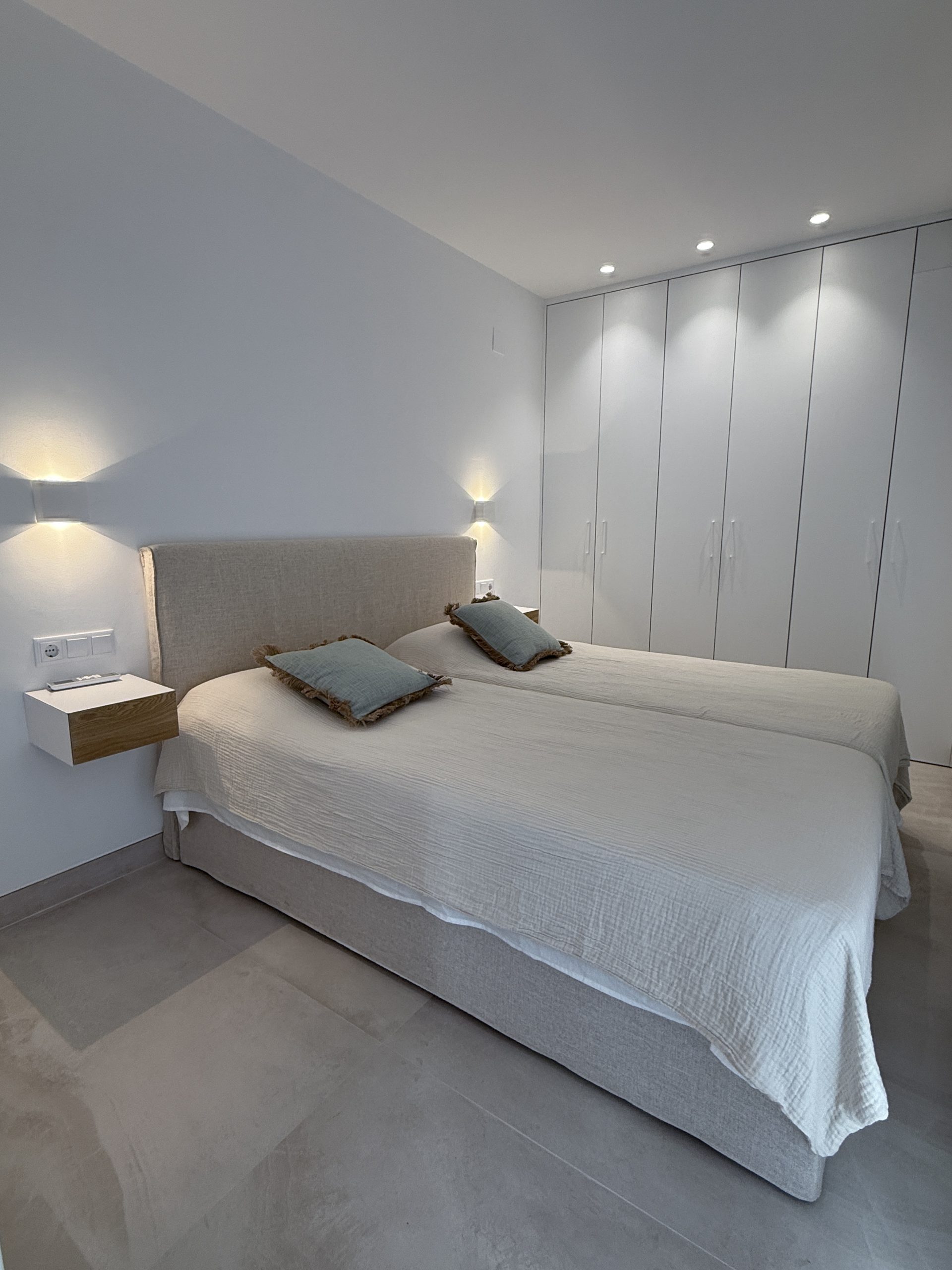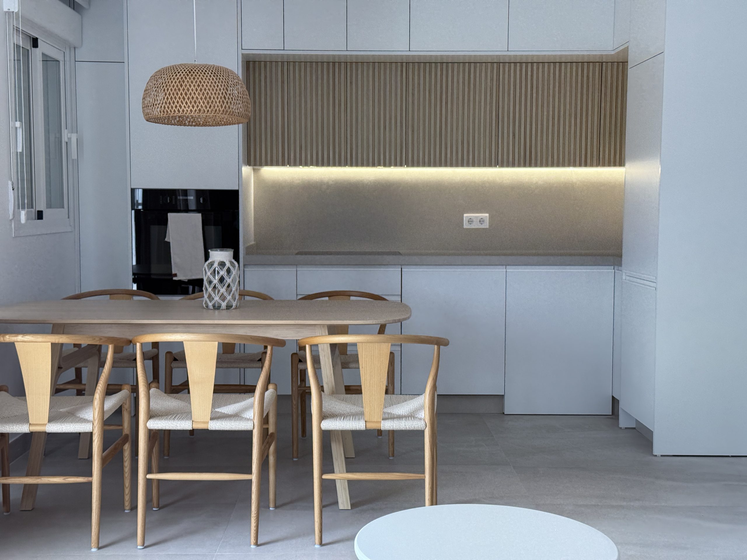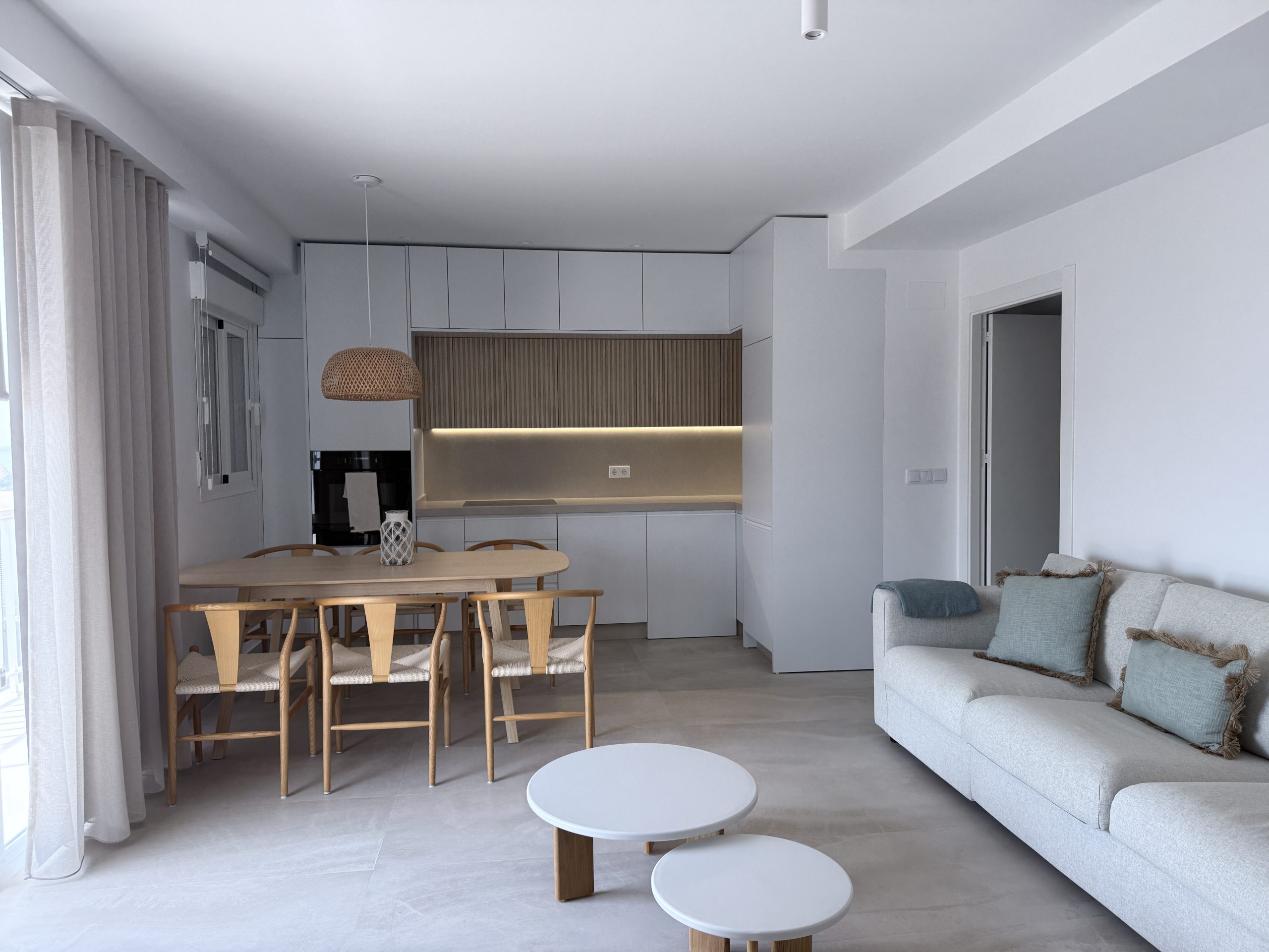 Reformar una vivienda situada frente al mar en un edificio con más de 50 años de antigüedad, realizando un diseño que responda a las necesidades del cliente y a un diseño mediterráneo acorde con la ubicación del mismo. Mejoramos la eficiencia de la vivienda colocando aislamiento térmico y acústico en fachada y tabiques medianeros, instalamos ventanas con doble acristalamiento y protección acústica y térmica consiguiendo así una mayor hermeticidad. En cuanto al diseño optamos por materiales de calidad superior que nos garanticen una gran durabilidad teniendo en cuenta que nos ubicamos justamente en frente del mar. Aprovechamos las vistas al mar para generar ventanas de suelo a techo que den mayor amplitud a la vivienda, consiguiendo un espacio luminoso y relajante.